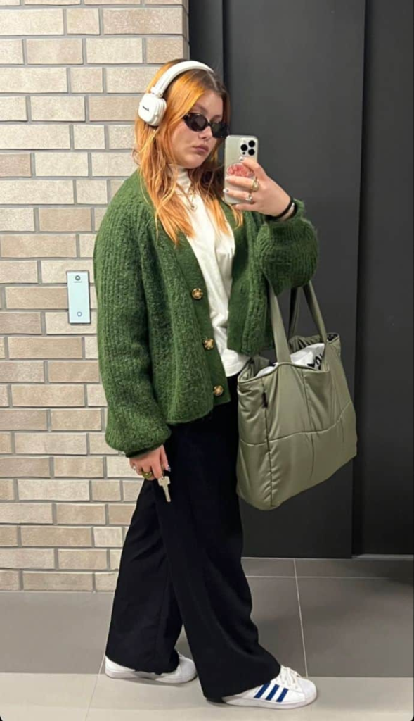 This outfit gives a neat and calm look that works well for cool mornings on campus. A soft cardigan adds warmth, while loose trousers keep the outfit comfortable for long hours.