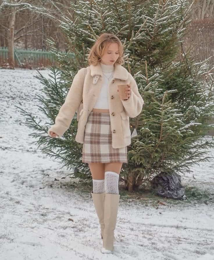 Layering clothes helps keep the body warm. A coat over a sweater and skirt makes the outfit look stylish.