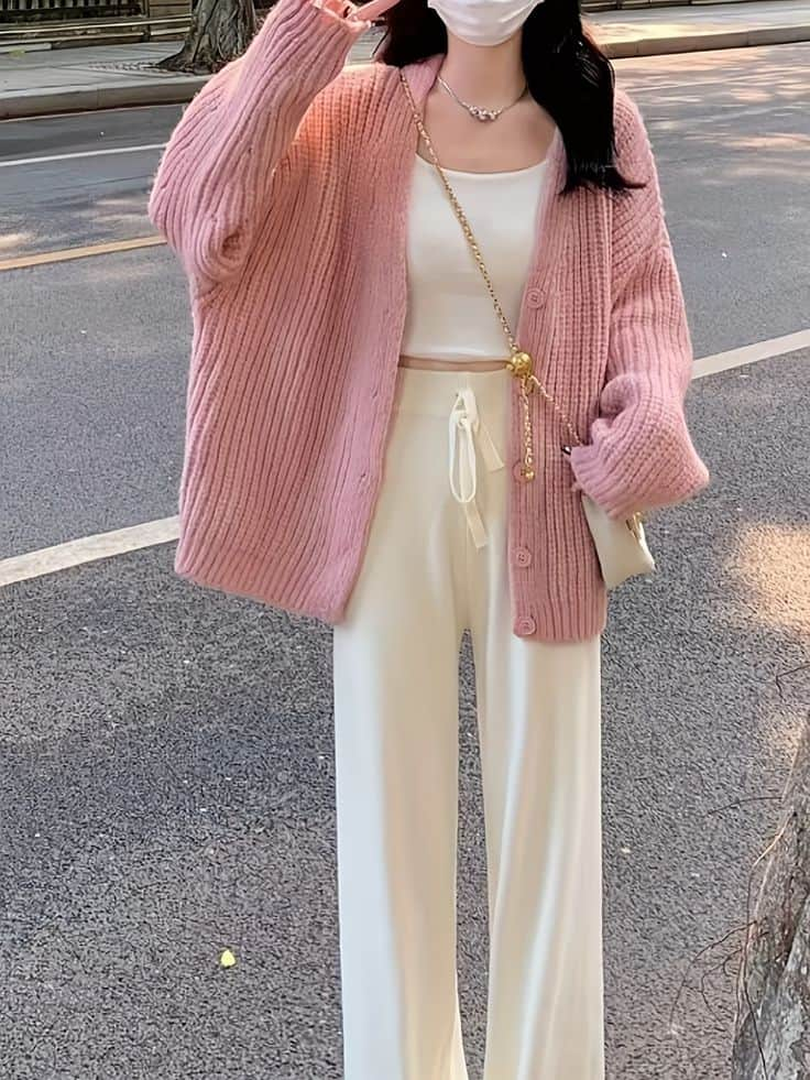Soft colors together make a clean and calm outfit. A cardigan adds warmth, and loose pants make it easy to move.