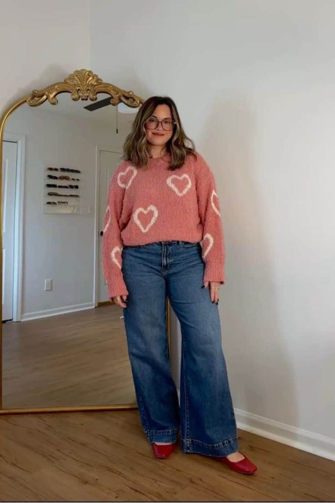 A warm sweater with wide jeans makes a relaxed outfit. Fun designs on the sweater make the look playful.
