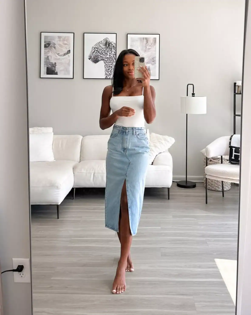 A light denim midi skirt paired with a simple white top creates a clean and fresh look that works well during fall. The longer skirt gives more coverage, which makes it suitable for cooler days.
