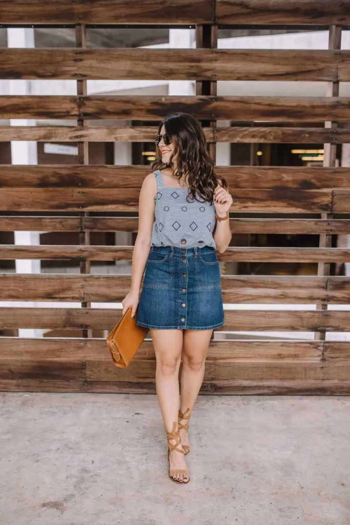 A button-front denim skirt gives a different shape that looks trendy and comfortable at the same time. Wearing it with a patterned top makes the outfit more interesting without being too bright.