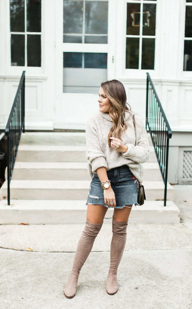 Long boots make the outfit more suitable for colder weather and also make the legs look longer. Mixing soft fabric with denim adds texture to the look.