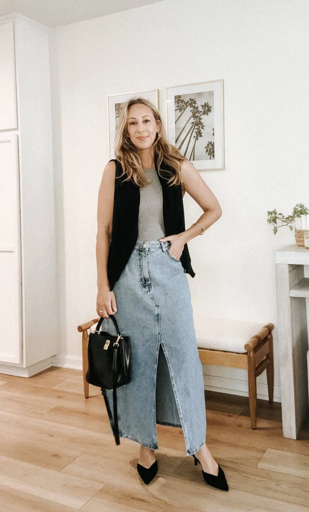 A long denim skirt can look very elegant when it is worn with layers. Adding a vest or jacket over a simple top makes the outfit look complete.