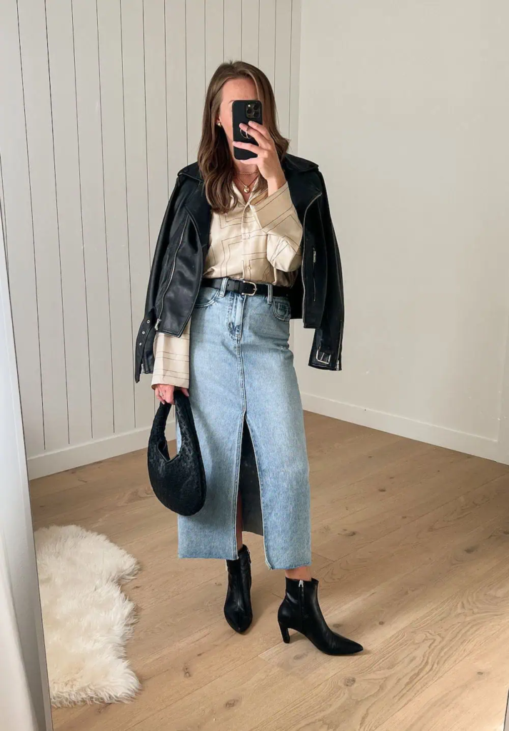 A long jean skirt with a jacket creates a strong fall look that feels modern. The jacket adds warmth and also makes the outfit look more stylish.