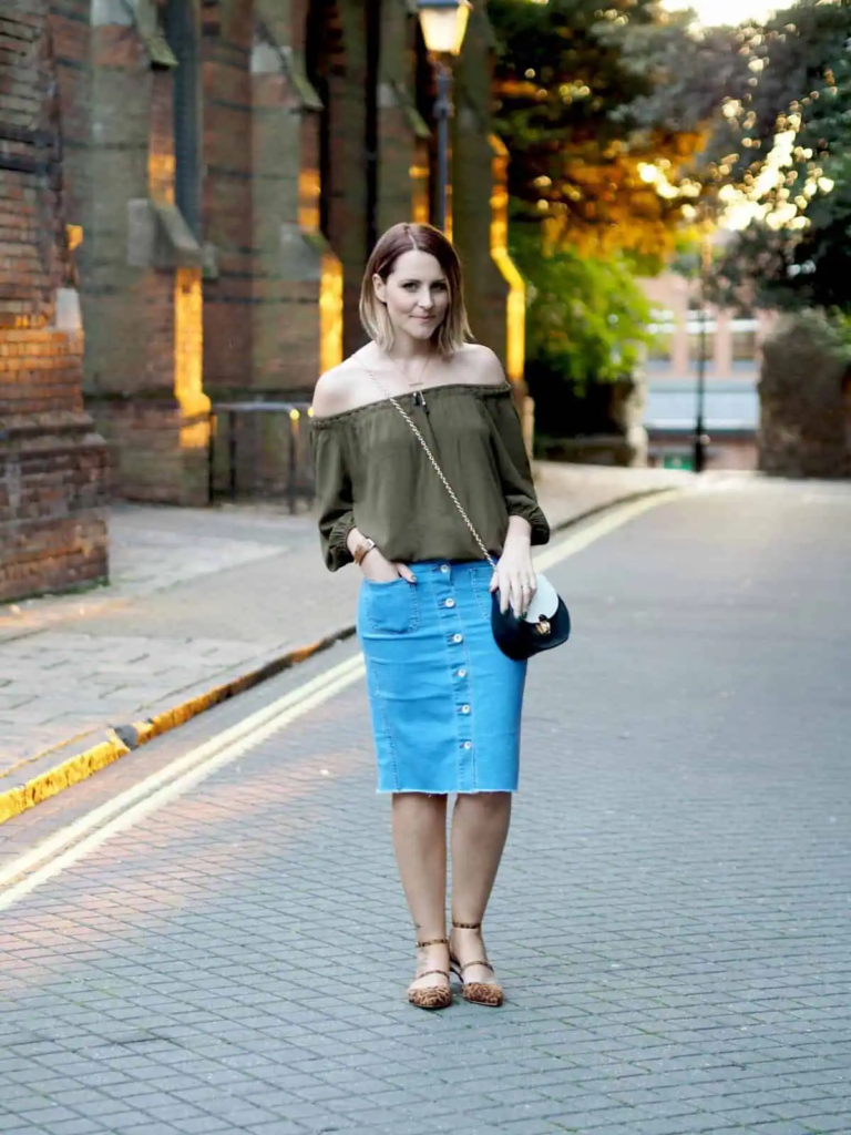 A denim skirt can also look dressy when worn with a stylish top. An off-shoulder or fitted top makes the outfit look more elegant.