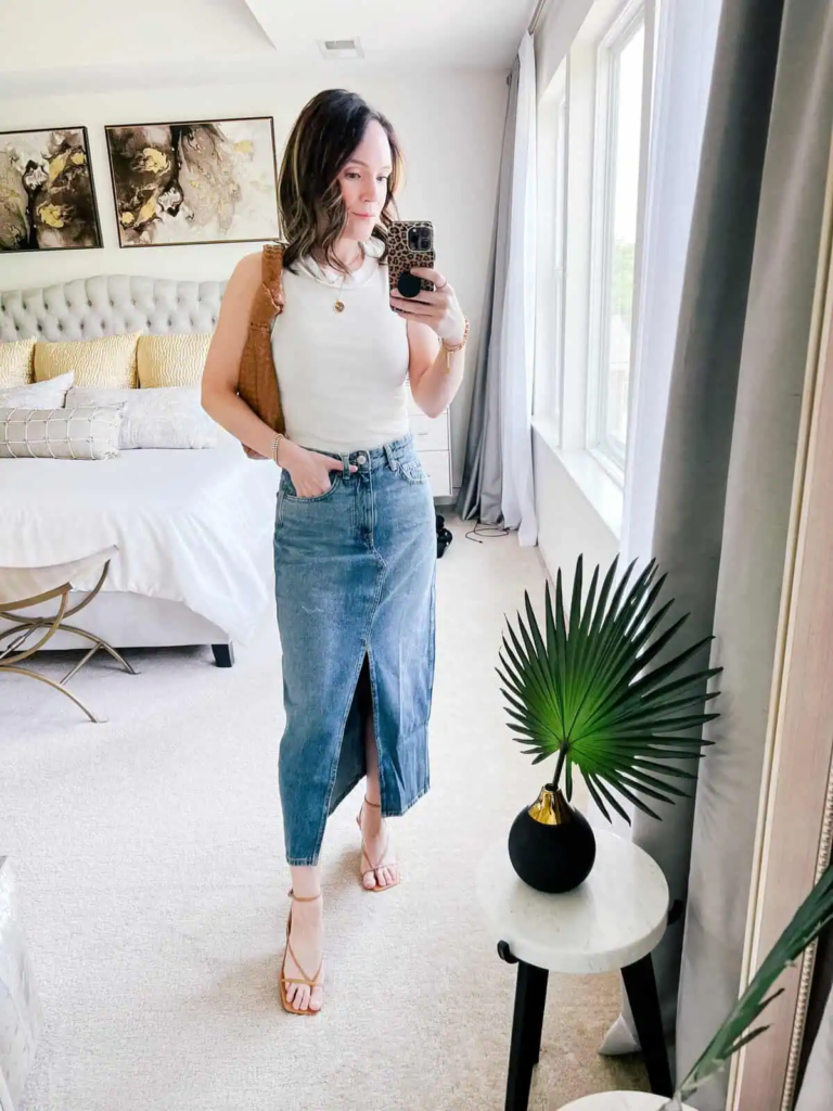A midi denim skirt with a fitted top makes a smart and modern look. A belt or bag can help shape the outfit and make it look more neat.