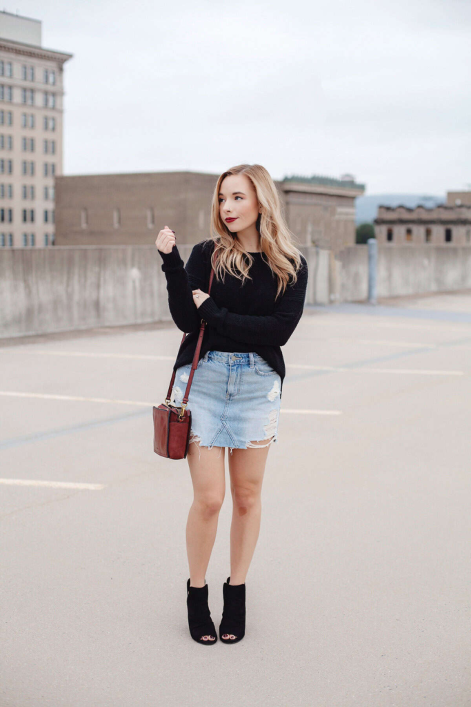A distressed denim skirt gives a more relaxed and bold look. A sweater balances the outfit and keeps it suitable for fall.