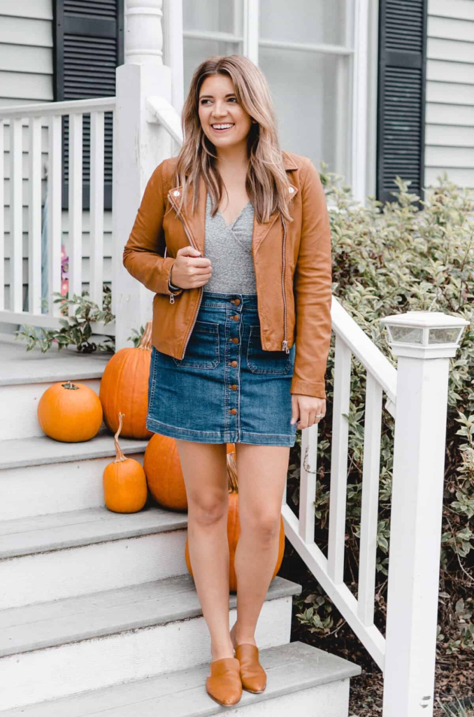 A denim skirt with a leather jacket makes a perfect fall combination. The jacket adds warmth and also makes the outfit look more fashionable.