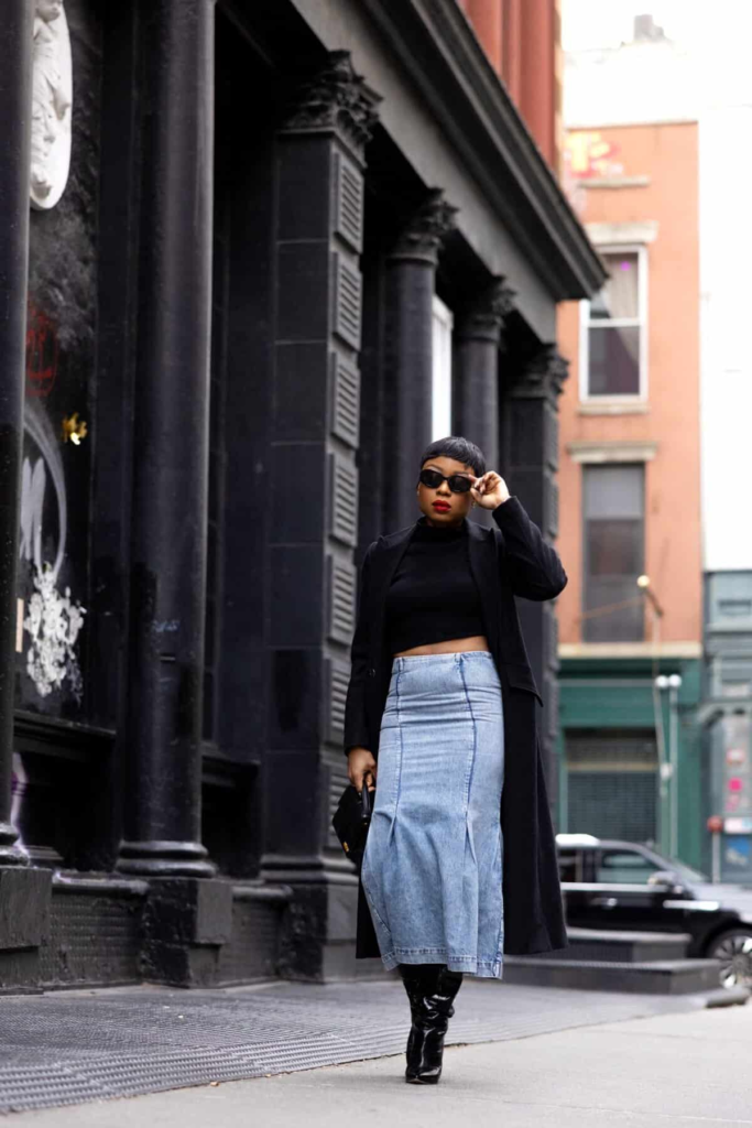 A long denim skirt with a coat creates a strong city style look. The coat makes the outfit warmer and more elegant.