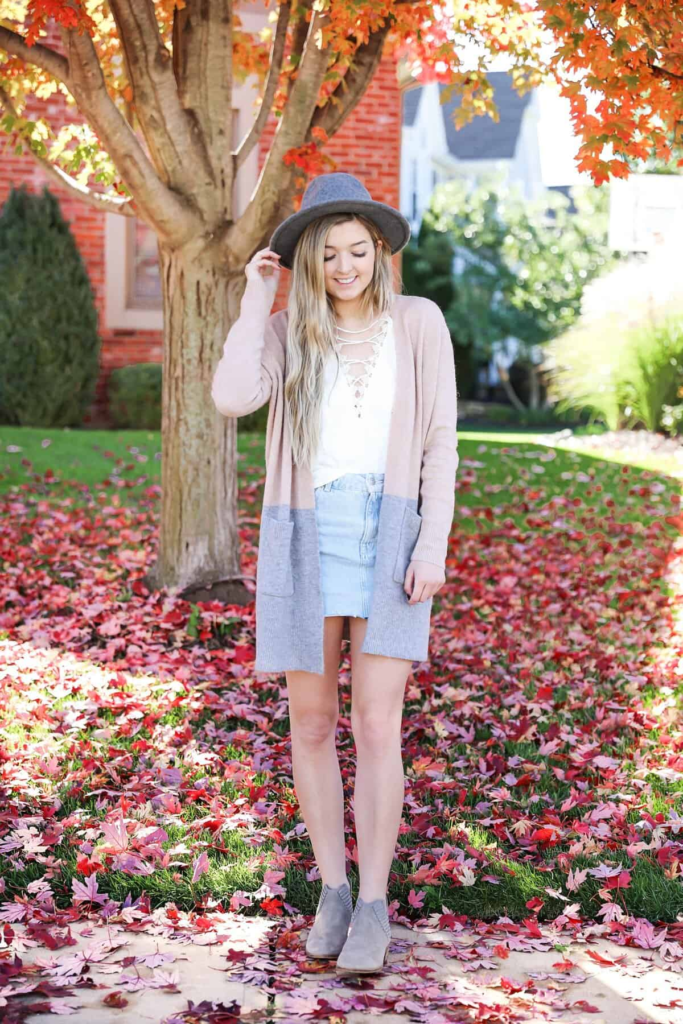 A cardigan with a denim skirt makes a soft and comfortable fall outfit. The extra layer helps keep you warm.
