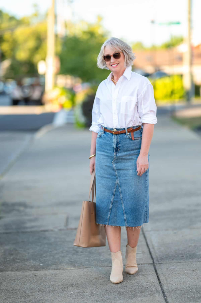 A white shirt with a denim skirt always looks clean and stylish. A belt can help shape the outfit and make it look better.