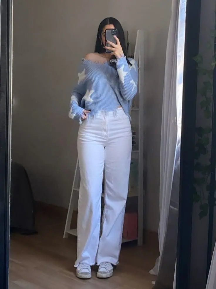 Wide-leg white jeans make the outfit look taller and more elegant. Sneakers keep the look casual enough for school while still looking stylish.