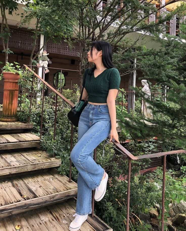 A cropped sweater with high-waisted jeans creates a retro look. Sneakers keep it casual.