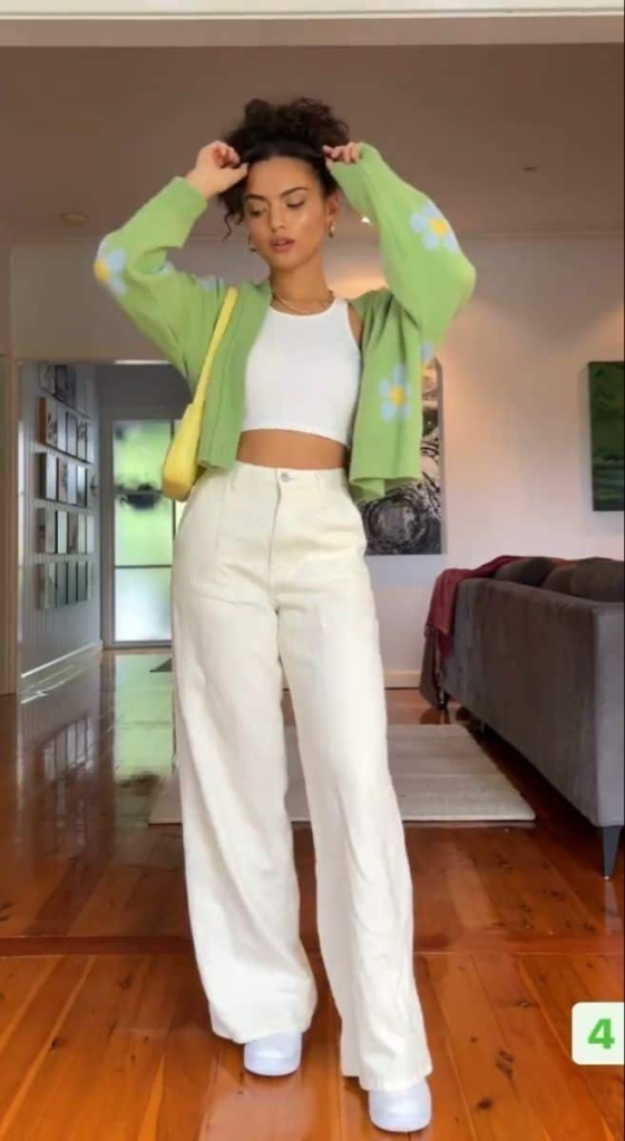 A cardigan with small floral details looks cute and stylish. Wide-leg pants make the outfit look elegant.