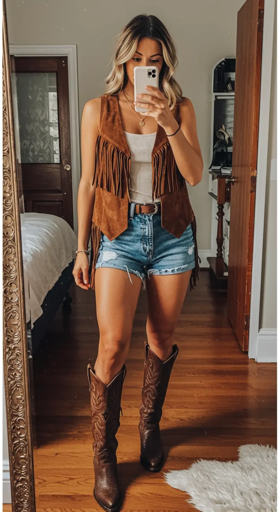 This outfit leans into traditional cowgirl energy. A fringed suede vest adds movement and texture, paired with simple denim cutoffs for balance. Tall cowboy boots elongate the silhouette, while turquoise accessories introduce a Southwestern accent.