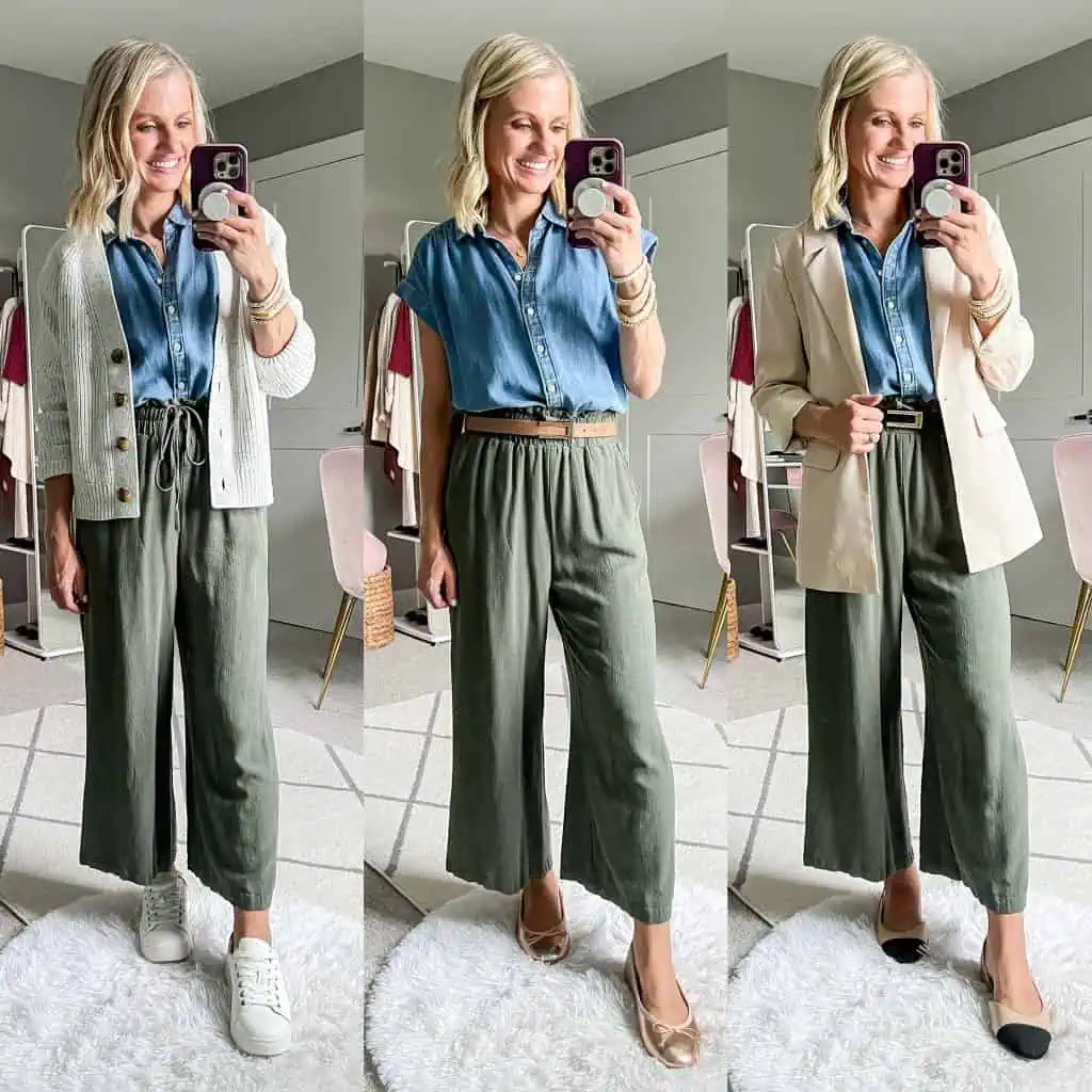 This outfit centers on olive wide-leg pants paired with a chambray shirt for a relaxed yet professional look. The neutral tones make it highly adaptable.