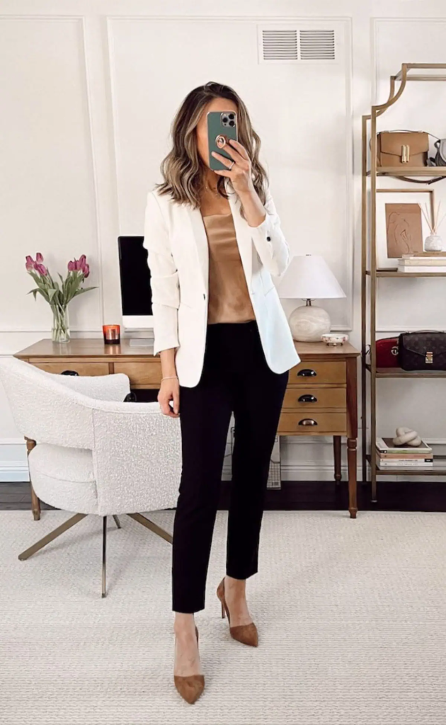This ensemble uses a tailored blazer to create a polished look layered over warm neutral tones. Dark trousers ground the outfit and maintain professionalism.