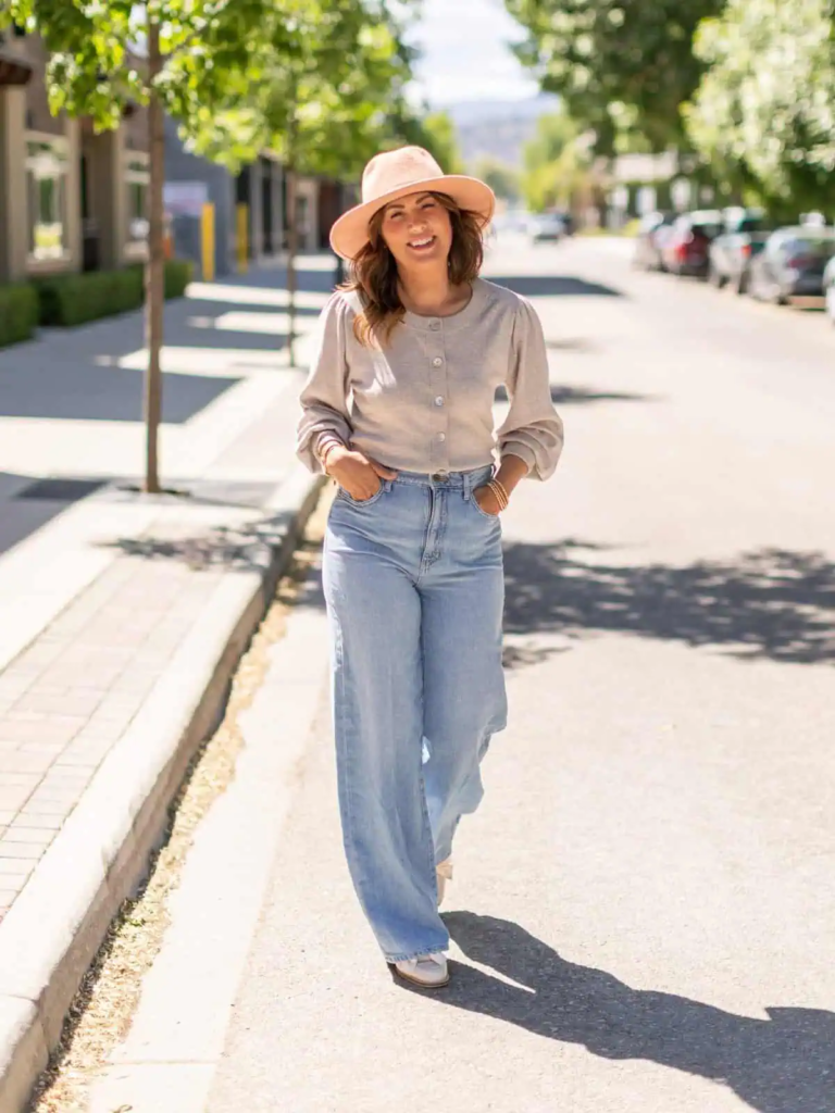 This outfit blends comfort with style through wide-leg jeans and a soft cardigan. The relaxed silhouette allows for all-day wear.