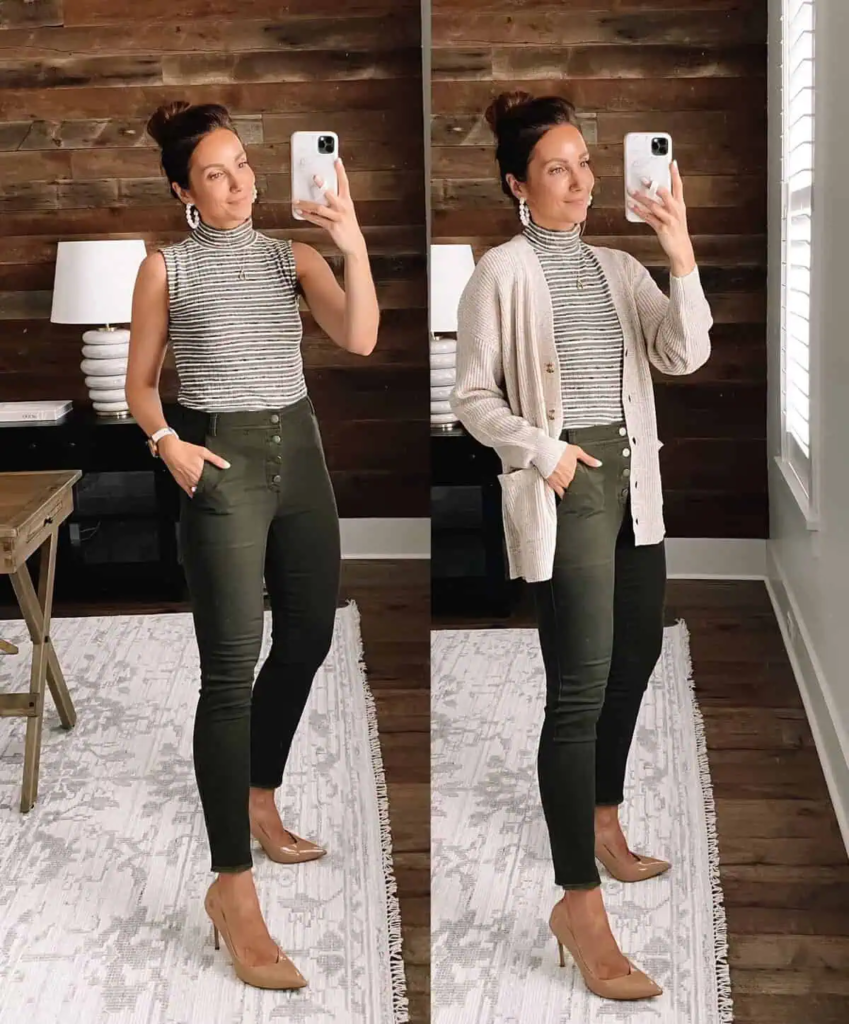 This layered outfit combines a striped turtleneck with fall-toned pants and a neutral cardigan. The layers make it adaptable to changing temperatures.