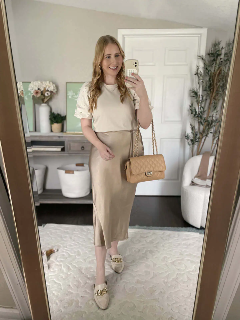 This look pairs a textured cream top with a camel midi skirt for a refined fall outfit. The soft tones feel elegant yet approachable.