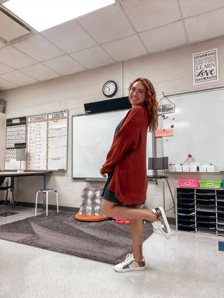 Neutral footwear completes the outfit, making it both practical and polished for everyday teaching while remaining approachable and stylish.
