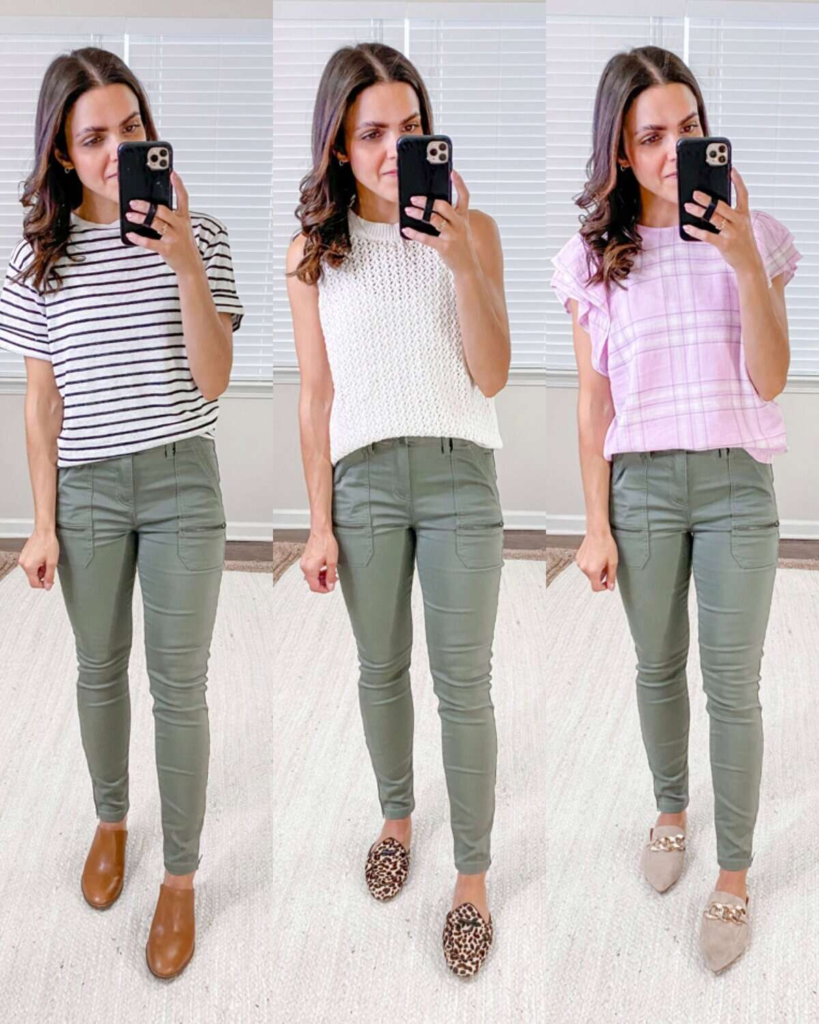 This section highlights how one pair of olive pants can work with multiple tops to create different looks. Each top brings a unique mood while staying fall-appropriate.