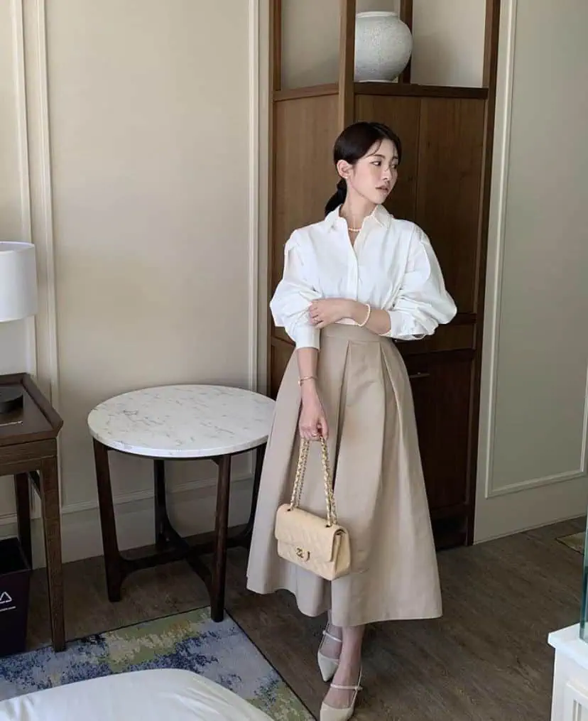 4. Neutral Shirt and Midi Skirt Ensemble