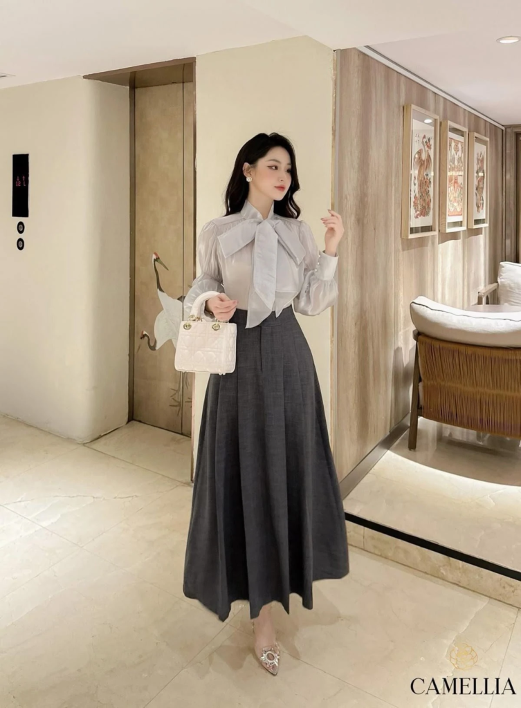 A cream silk blouse with bow detailing paired with a charcoal midi skirt creates a romantic yet professional silhouette.