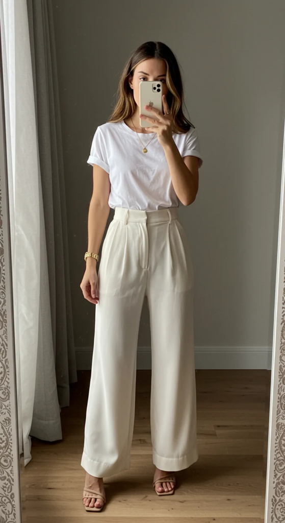 1. Monochrome Magic: White Tee & Wide-Leg Trousers
