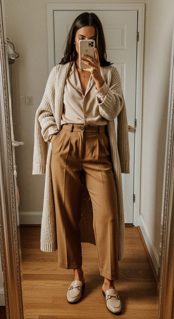Tonal dressing in shades of beige, cream, and taupe exudes sophistication. Pair a silk blouse with high-waisted trousers and a long cardigan for a harmonious minimalist ensemble.