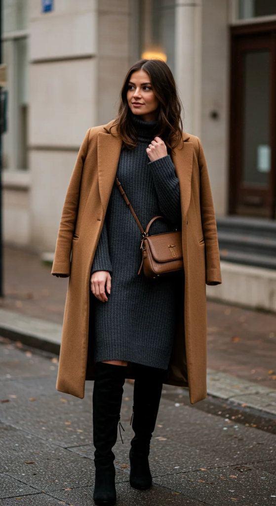 Stay cozy yet polished with a charcoal grey ribbed sweater dress that falls just below the knee. Layer with a long camel coat and knee-high black boots for warmth and elegance.