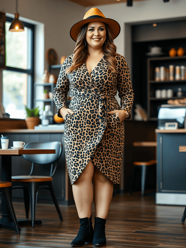This look emphasizes comfort and flattering design. The wrap dress naturally enhances shape while remaining easy to wear. Seasonal prints and accessories help transition the outfit into fall, making it both practical and stylish.