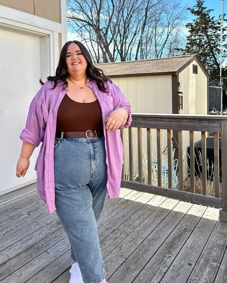 Lavender oversized button-up worn open over brown top and denim jeans.