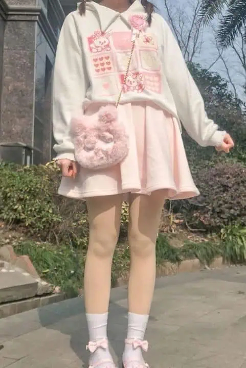 A white hoodie with pink accents provides comfort and warmth.