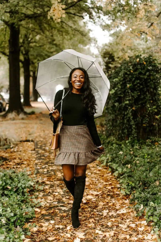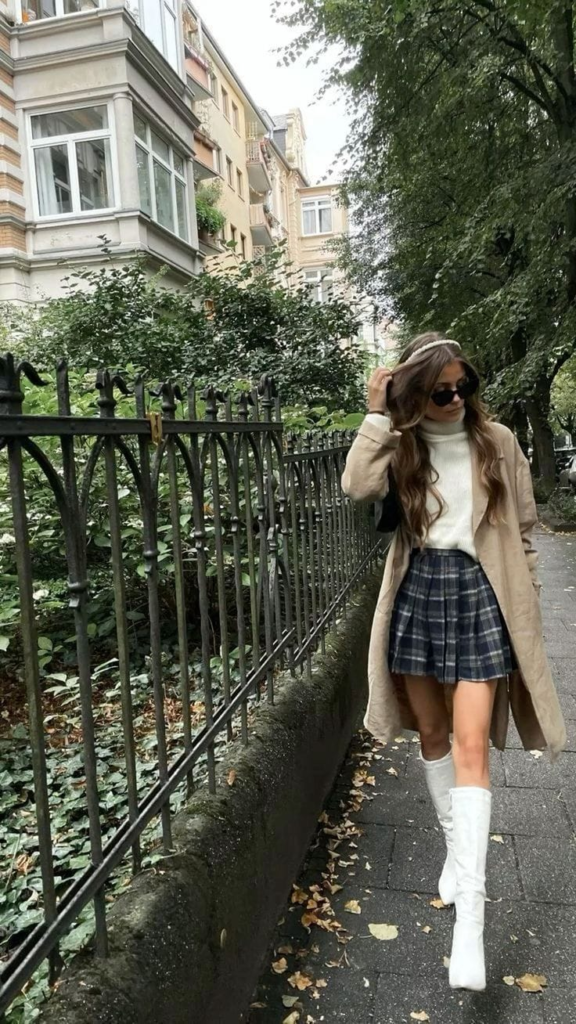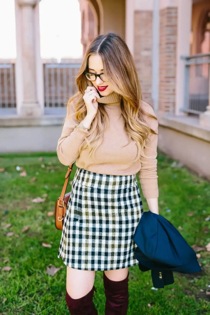 A turtleneck sweater keeps you warm while still looking smart. A plaid skirt adds the classic preppy style that works well in autumn.