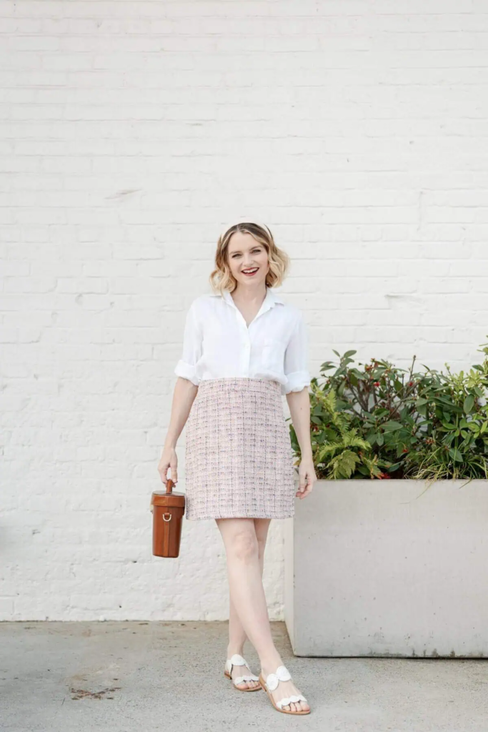 A white shirt always looks neat and professional. A tweed skirt adds a soft fall feeling.