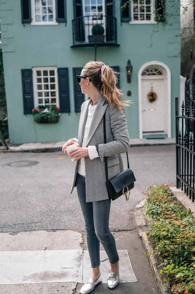 A sweater under the blazer keeps you warm. Loafers add a modern detail.