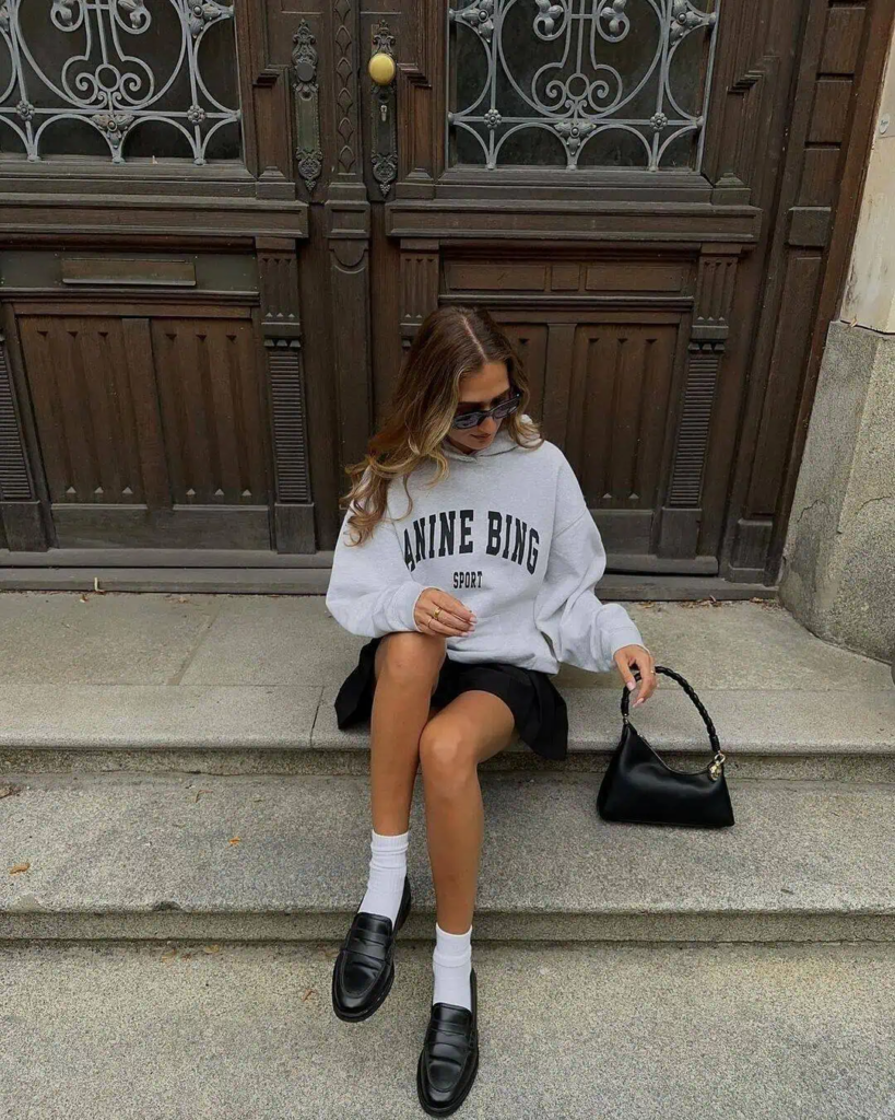 A sweatshirt with a skirt makes a mix of comfort and style. Loafers keep the outfit neat.