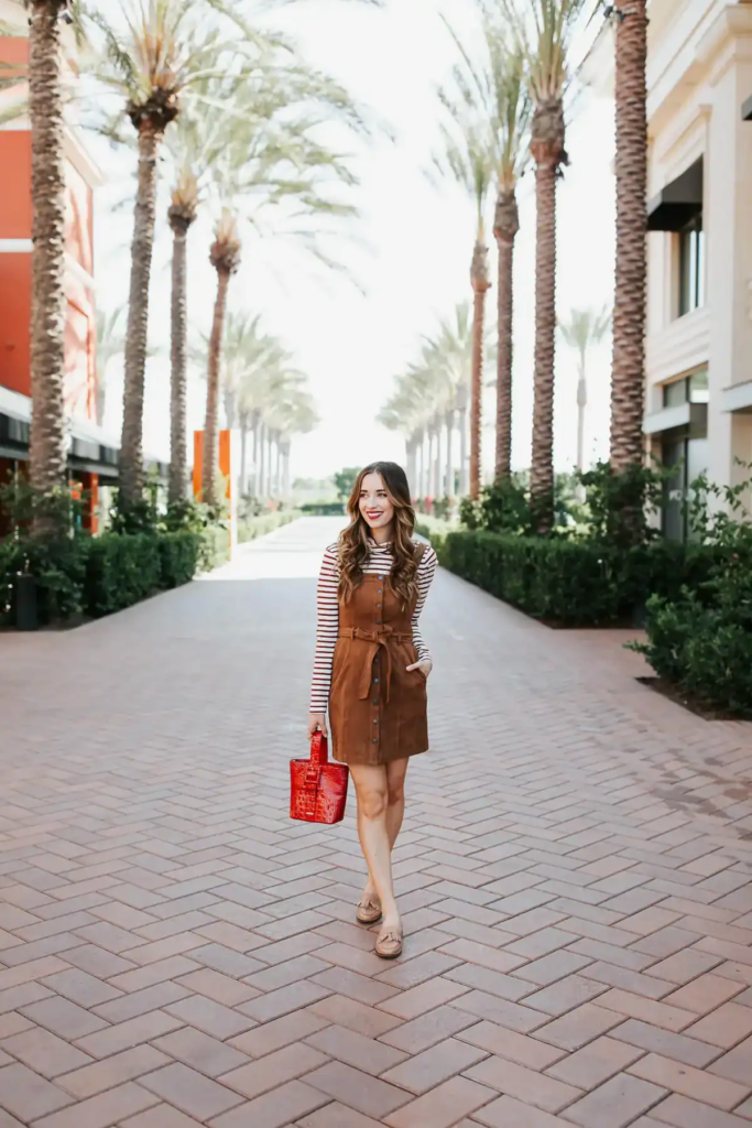 A pinafore dress looks classic in fall. A striped top under it adds detail.