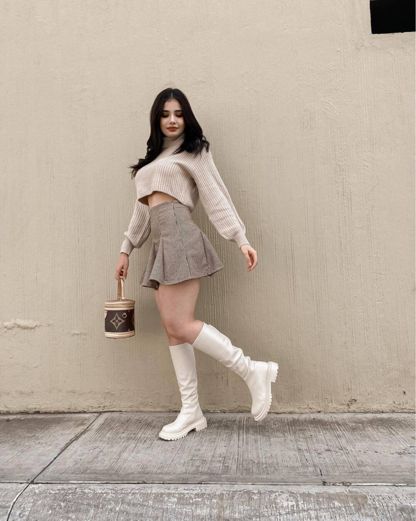A cropped sweater with a pleated skirt makes a classic preppy outfit. Boots keep it warm.