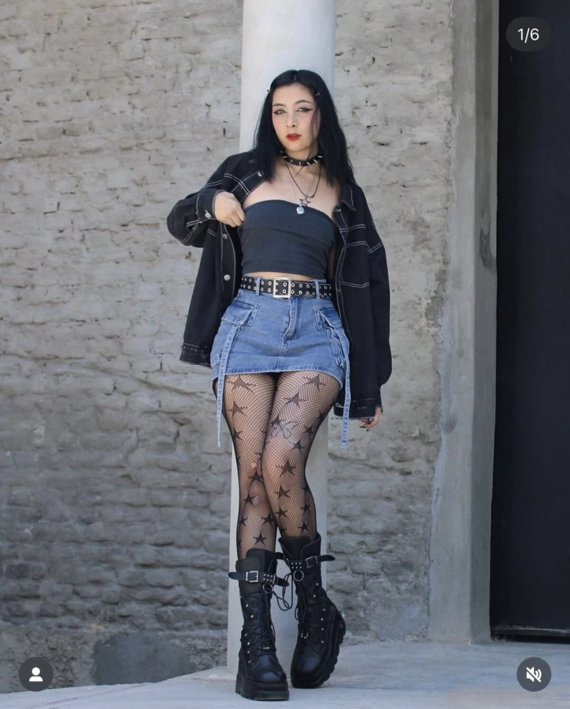 An oversized black blazer over a strapless crop top adds sophistication to a casual denim mini skirt. Fishnet tights and studded combat boots amplify the rock aesthetic. Add a studded belt for extra flair. This combination balances edgy textures with approachable silhouettes, perfect for first-row energy or club shows.