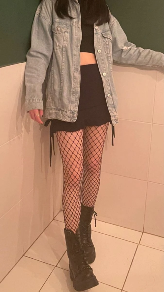 Pair an oversized denim jacket with a black crop top and fishnet tights. Black lace-up boots anchor the look, while an accent belt adds a pop of color. This classic rock ensemble is practical for long shows yet stylish enough to stand out.