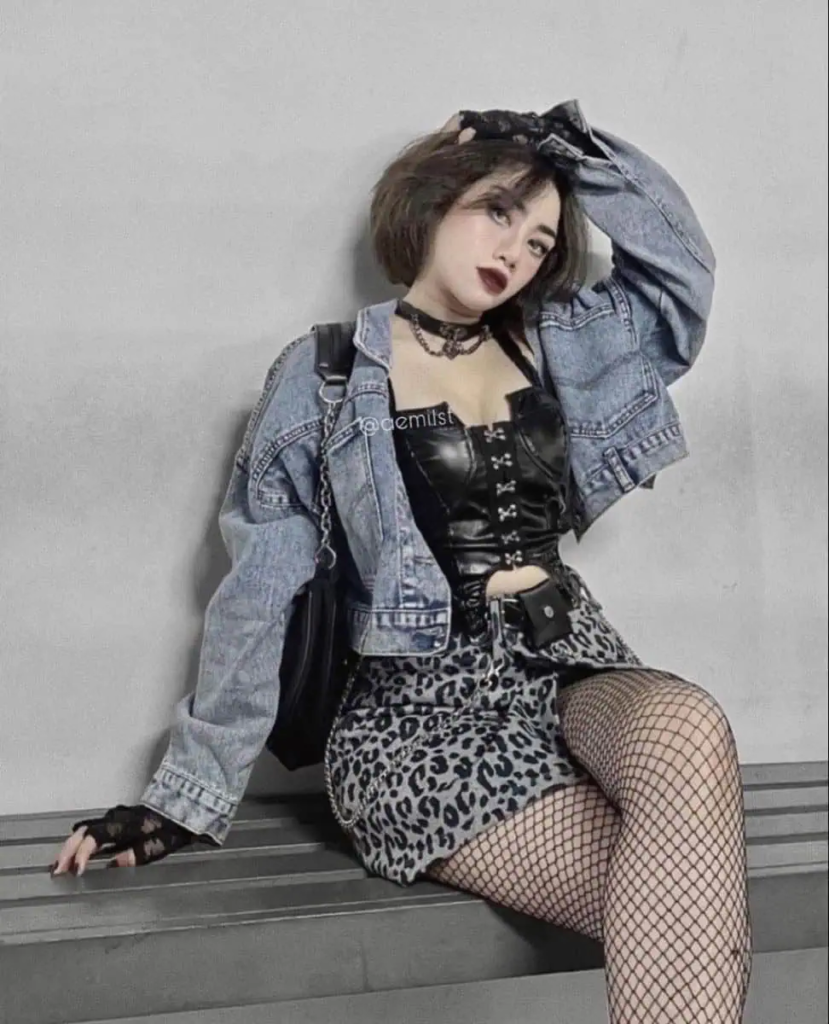 Layer an oversized denim jacket over a black leather corset for a grunge-meets-Y2K look. Pair with a leopard print mini skirt and fishnet tights for texture. Accessorize with a choker and minimalist jewelry to maintain stage-ready comfort while expressing bold style.