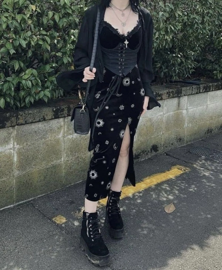 A celestial-print maxi dress paired with a structured black corset creates dramatic flair. Combat boots and an oversized cardigan provide practicality and comfort. Layer silver jewelry to enhance gothic-rock vibes. This outfit is perfect for commanding attention without sacrificing mobility.
