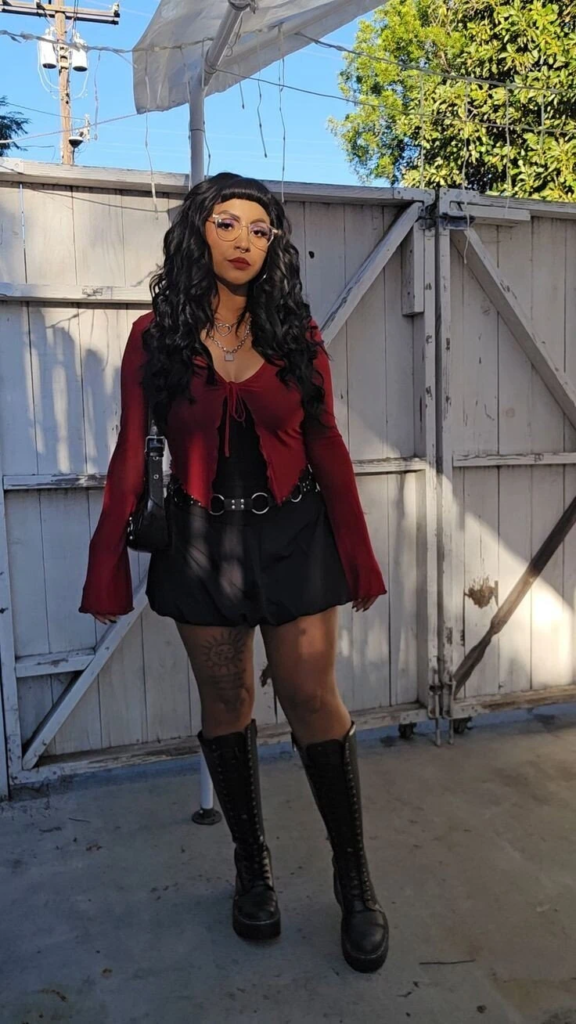 A rich burgundy cardigan paired with black mini shorts and lace-up boots creates a bold stage-ready look. Bell sleeves add movement, while a harness belt, layered chains, and gold-rimmed glasses bring attitude and edge. Ideal for festival-goers seeking standout style.