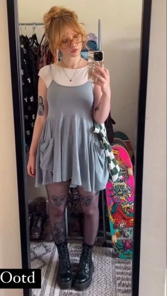 A baby-blue tee dress paired with black combat boots balances feminine softness with rock attitude. Add patterned tights, layered chains, and a white t-shirt underneath for texture and depth. Vintage glasses and a tousled bun complete this effortlessly cool aesthetic.