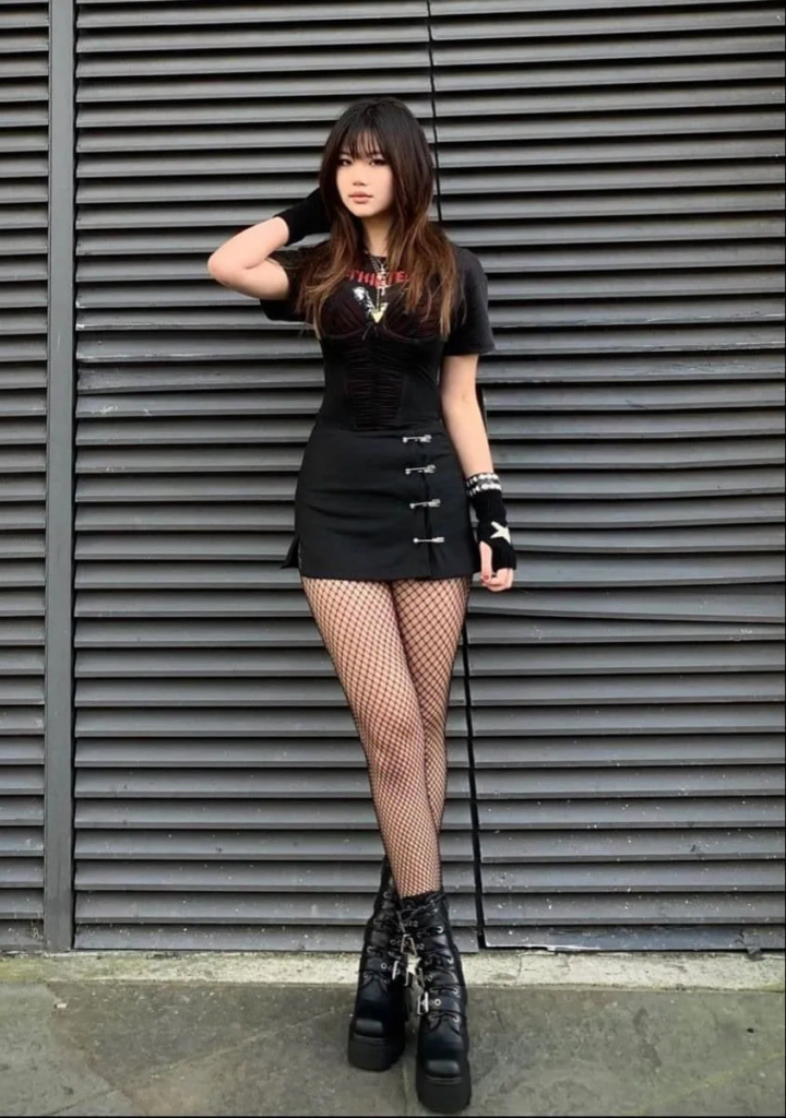 A mesh crop top with strategic cutouts paired with a black mini skirt, platform boots, and sheer tights balances sexy and edgy perfectly. Ideal for alternative, pop-punk, or indie concerts.