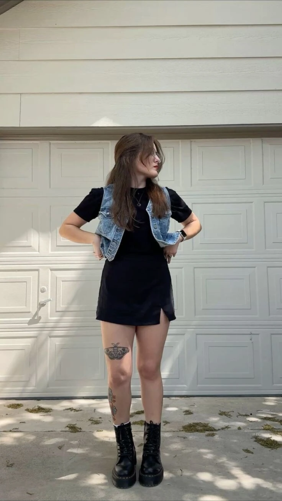 A cropped denim vest layered over a black mini dress completes the ultimate rock concert look. Combat boots ground the outfit, while accessories reflect personal style. This combination balances comfort, style, and stage presence for any rock venue.