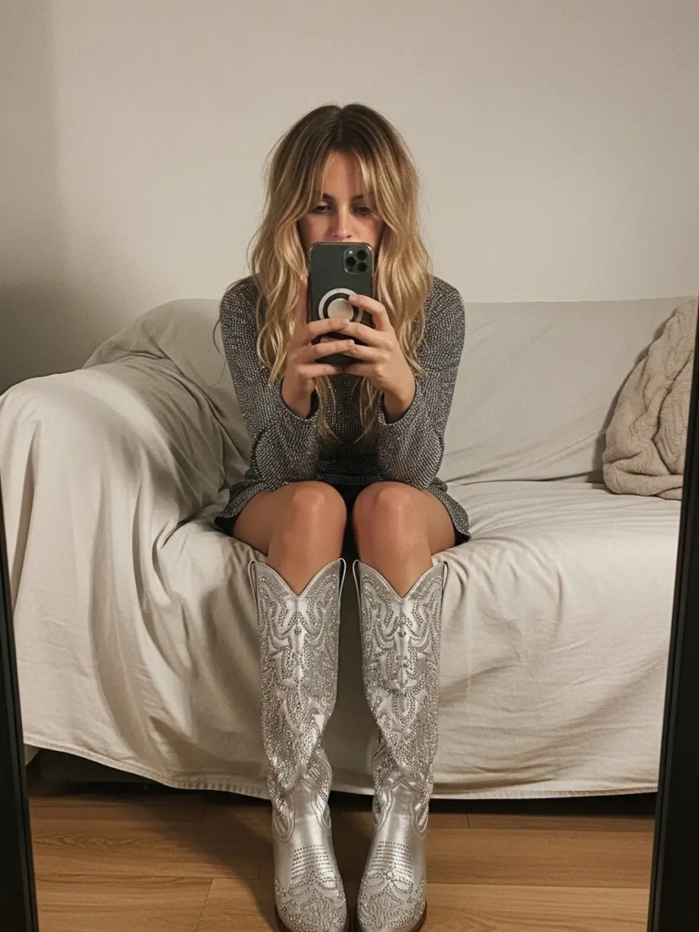6. Sparkly Silver Mini Dress and Rhinestone Cowboy Boots